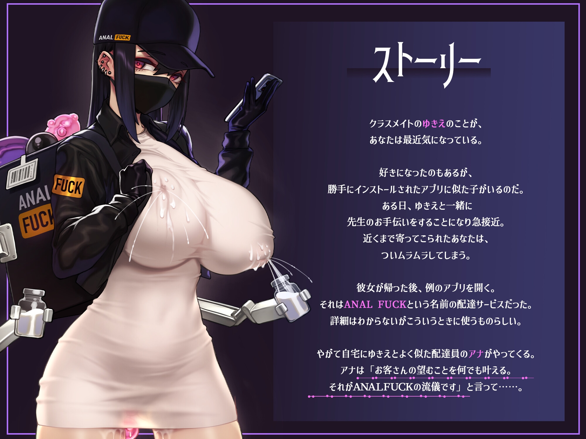 クラスメイトのゆきえのことが、あなたは最近気になっている。 好きになったのもあるが、勝手にインストールされたアプリに似た子がいるのだ。 ある日、ゆきえと一緒に先生のお手伝いをすることになり急接近。 近くまで寄ってこられたあなたは、ついムラムラしてしまう。 彼女が帰った後、例のアプリを開く。 それはANALFUCKという名前の配達サービスだった。 詳細はわからないがこういうときに使うものらしい。 やがて自宅にゆきえとよく似た配達員のアナがやってくる。 アナは「お客さんの望むことを何でも叶える。 それがANALFUCKの流儀です」と言って……。