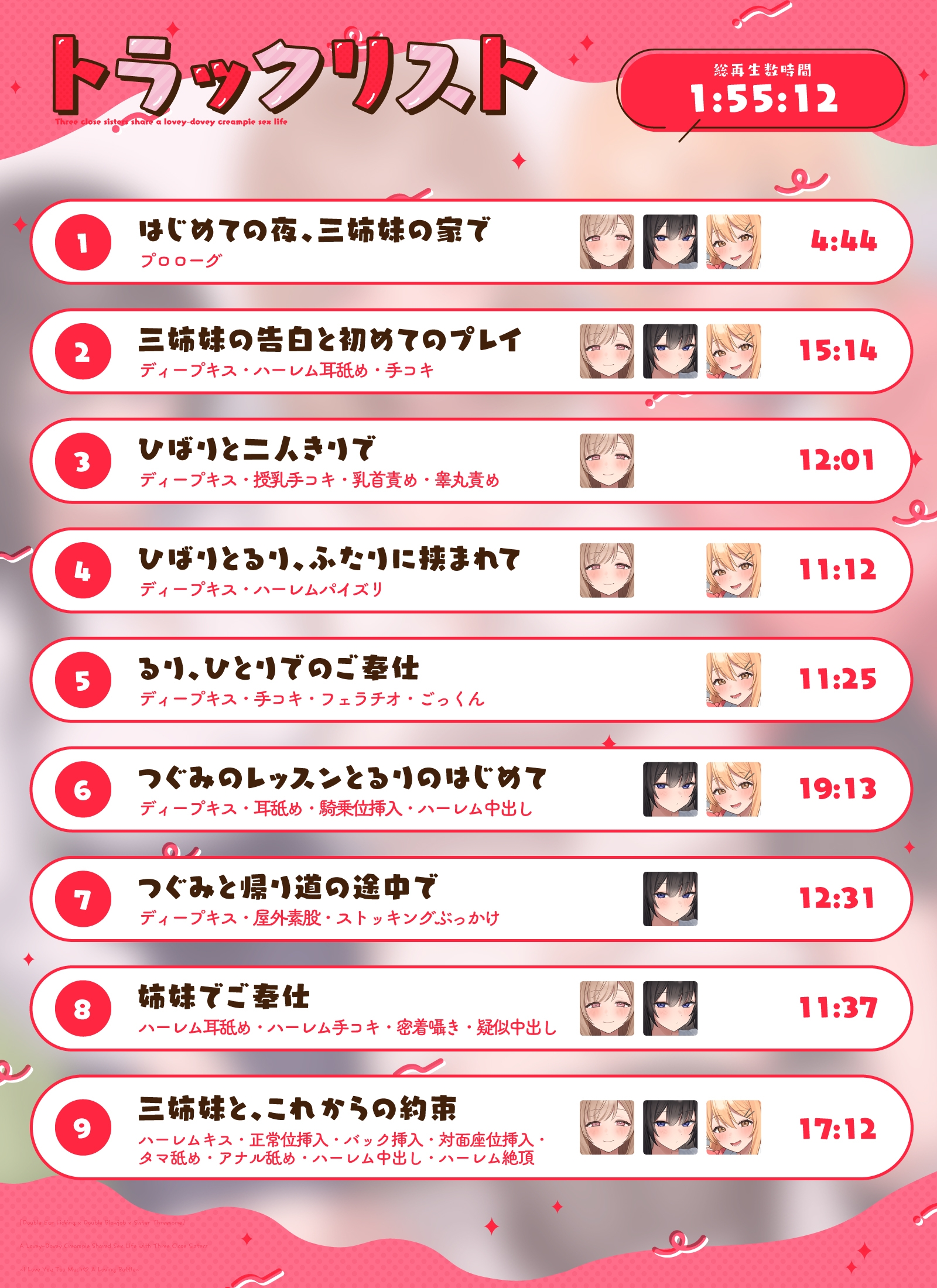 「【W耳舐め×Wフェラ×姉妹丼】仲良し三姉妹といちゃラブ中出しシェア性活~すきすき連呼♡らぶらぶ取り合い~」RJ01494053の詳細情報
