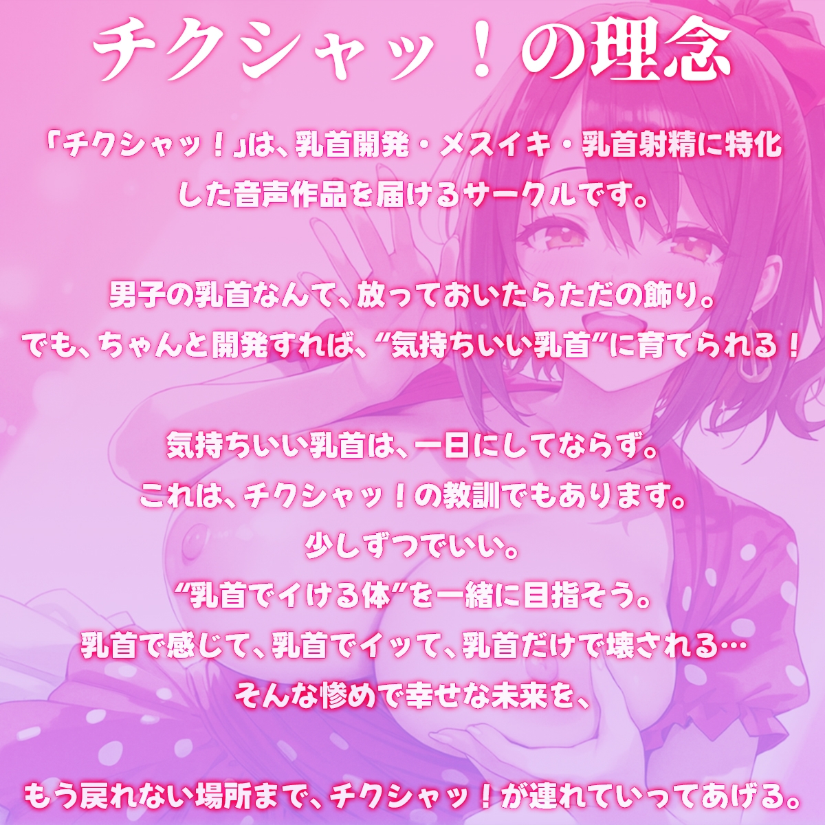 「チクシャッ!」は、乳首開発・メスイキ・乳首射精に特化した音声作品を届けるサークルです。