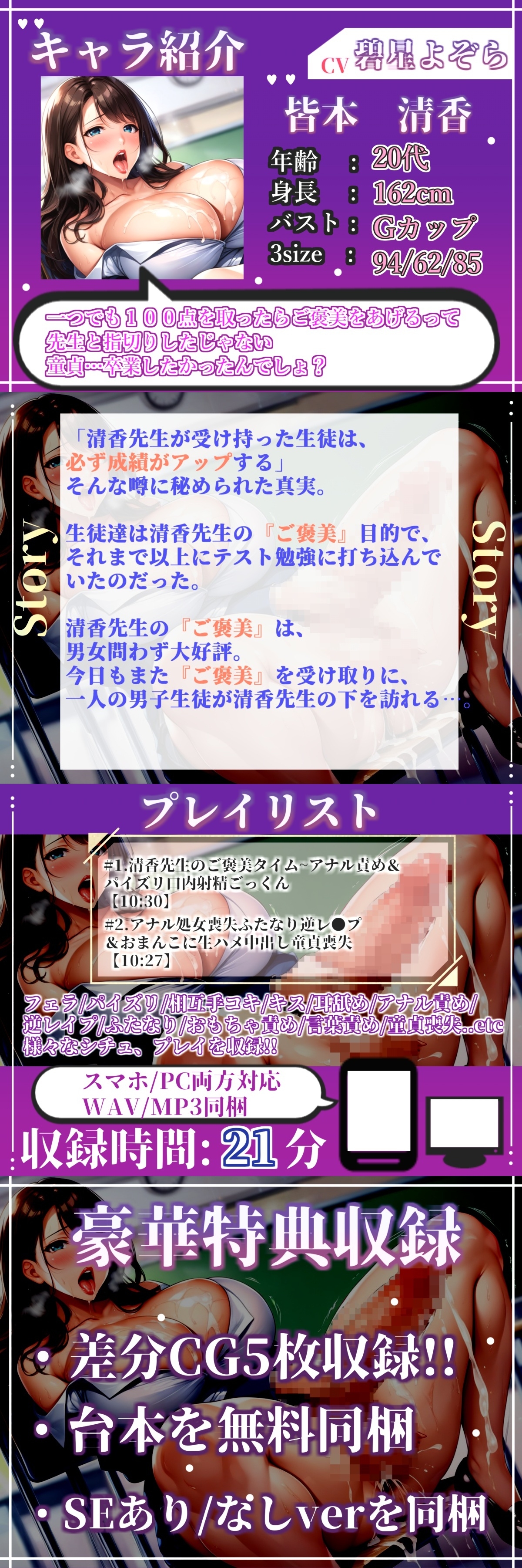 今日もまた『ご褒美』を受け取りに、一人の男子生徒が清香先生の下を訪れる…。